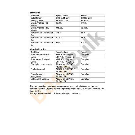 NMT 100 cfu/g as USP/NF, Ph.Eur., BP