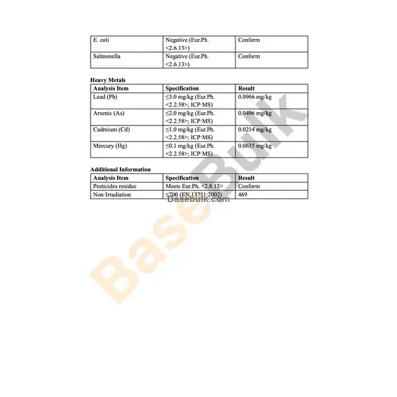 Lead (Pb) | ≤3.0 mg/kg (Eur.Ph. <2.2.58>; ICP‑MS) | 0.0966 mg/kg |