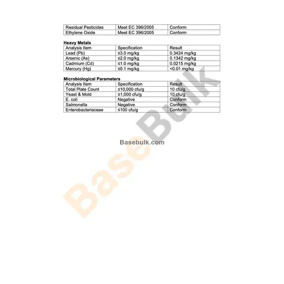 Total Plate Count | ≤10,000 cfu/g | 10 cfu/g |