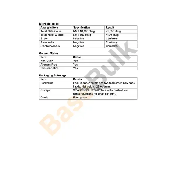 Packaging | Pack in paper-drums and two food grade poly bags inside. Net weight: 25 kg/drum. |