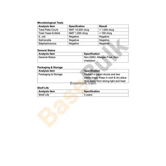 Packaging & Storage | Packed in paper-drums and two plastic-bags. Keep in cool & dry place. Stay away from strong light and heat. |