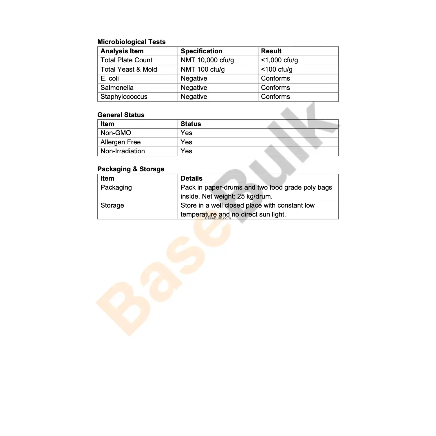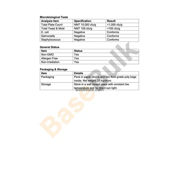 Packaging | Pack in paper-drums and two food grade poly bags inside. Net weight: 25 kg/drum. |