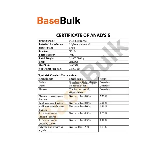 Silymarin, expressed as silybin | Not less than 1.5 % | 1.58 % |