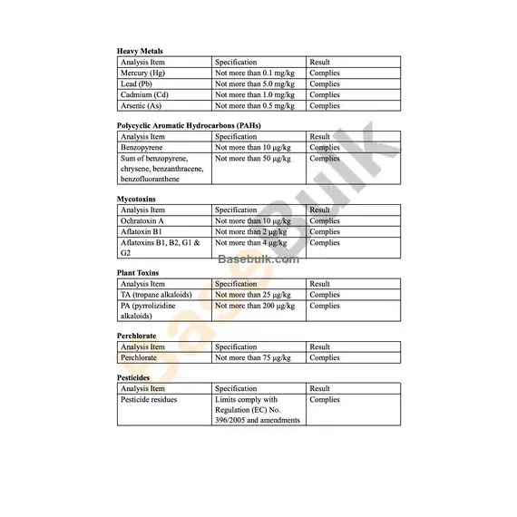 PA (pyrrolizidine alkaloids) | Not more than 200 μg/kg | Complies |