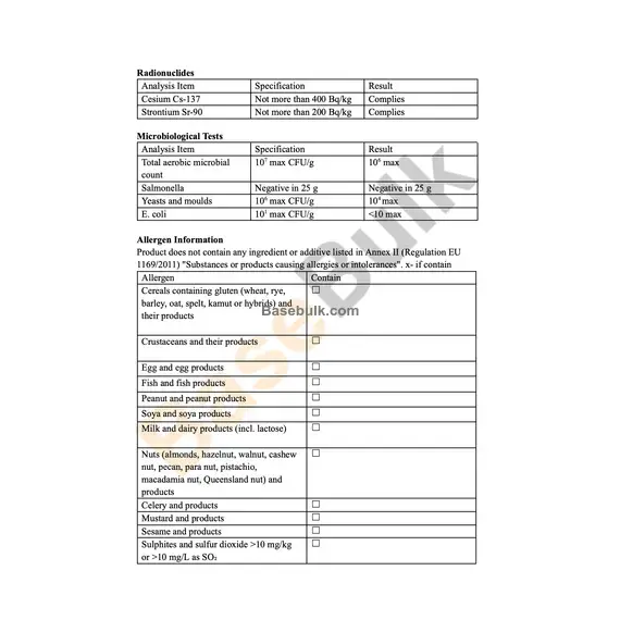Cesium Cs-137 | Not more than 400 Bq/kg | Complies |