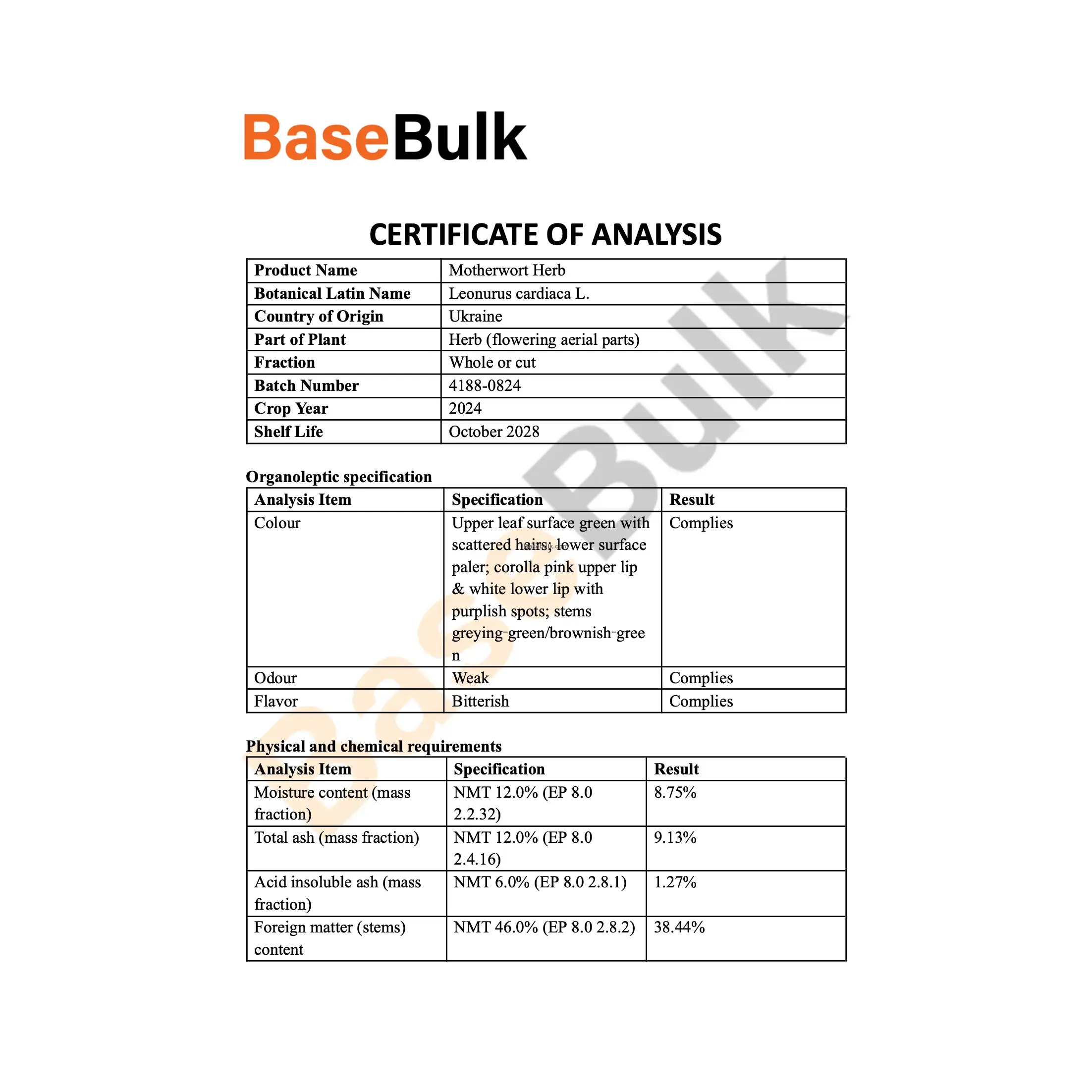 Foreign matter (stems) content | NMT 46.0% (EP 8.0 2.8.2) | 38.44% |