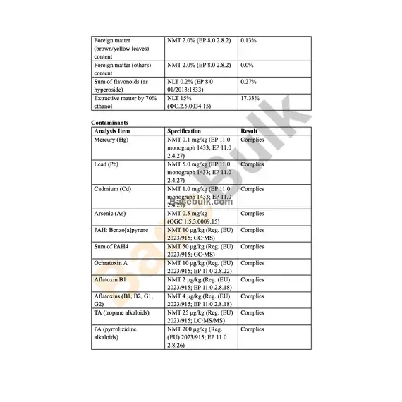 Foreign matter (brown/yellow leaves) content | NMT 2.0% (EP 8.0 2.8.2) | 0.13% |