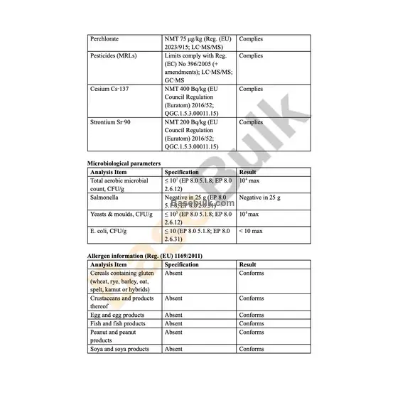 Perchlorate | NMT 75 μg/kg (Reg. (EU) 2023/915; LC‑MS/MS) | Complies |