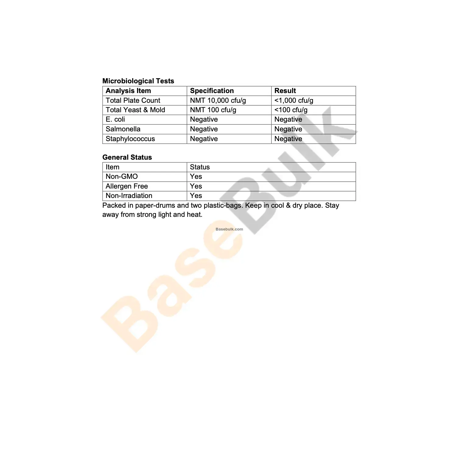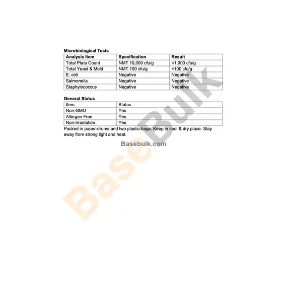 Packed in paper-drums and two plastic-bags. Keep in cool & dry place. Stay away from strong light and heat.