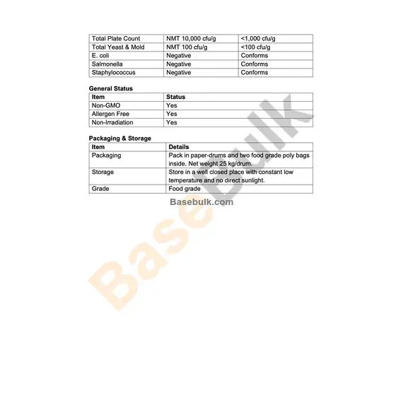 Packaging | Pack in paper-drums and two food grade poly bags inside. Net weight 25 kg/drum. |