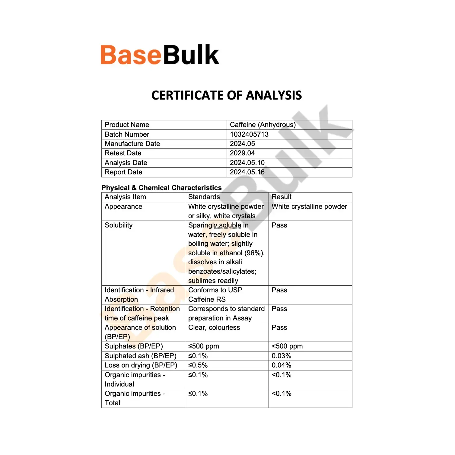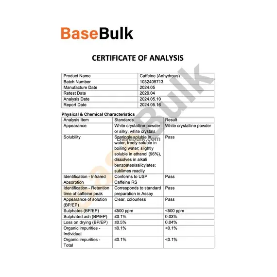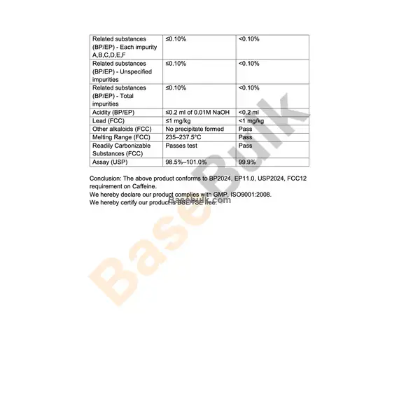 Conclusion: The above product conforms to BP2024, EP11.0, USP2024, FCC12 requirement on Caffeine. We hereby declare our product complies with GMP, ISO9001:2008. We hereby certify our product is BSE/TSE free.