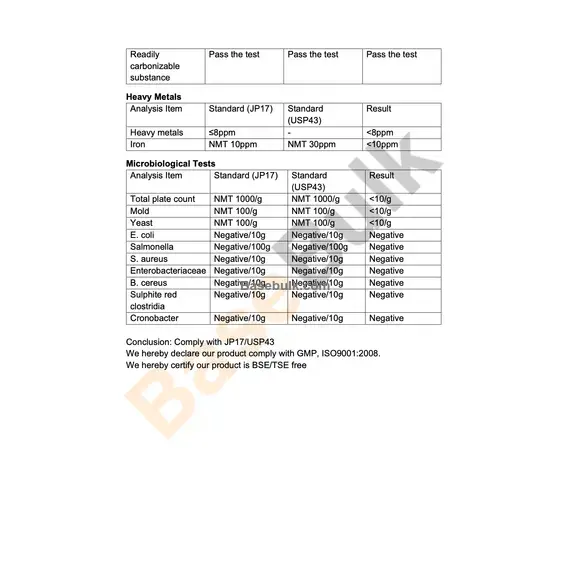 Conclusion: Comply with JP17/USP43 We hereby declare our product comply with GMP, ISO9001:2008. We hereby certify our product is BSE/TSE free