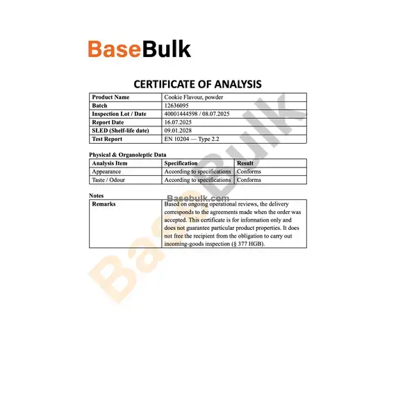 Remarks | Based on ongoing operational reviews, the delivery corresponds to the agreements made when the order was accepted. This certificate is for information only and does not guarantee particular product properties. It does not free the recipient from the obligation to carry out incoming-goods inspection (§ 377 HGB). |