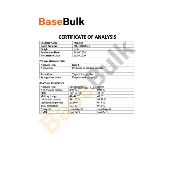 Taste/Odor | Typical for menthol |
