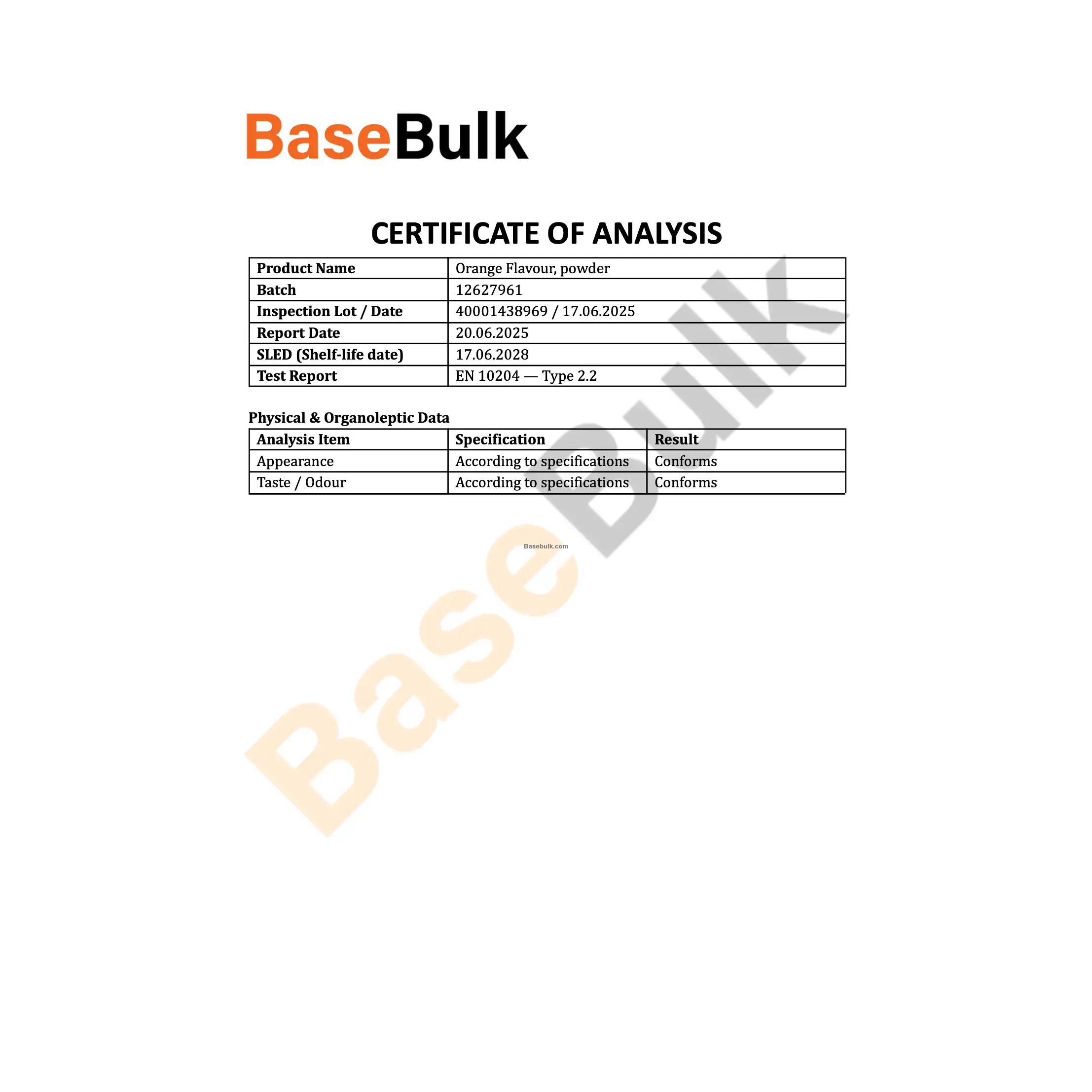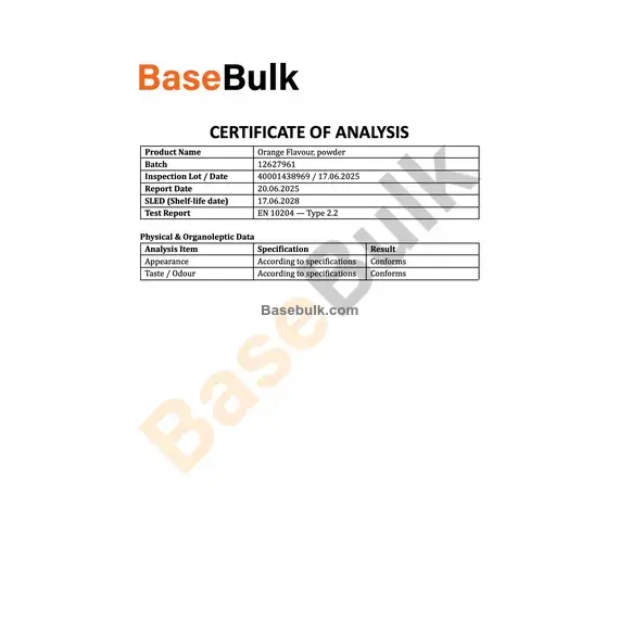 Taste / Odour | According to specifications | Conforms |