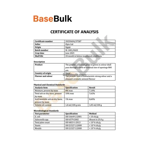 Flavour and odour | The powder have a characteristic strong odour and a pleasant aromatic aniseed flavour |