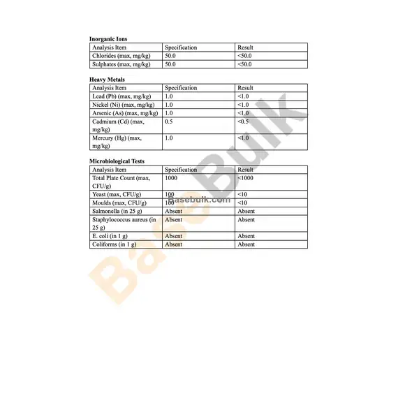 Chlorides (max, mg/kg) | 50.0 | <50.0 |