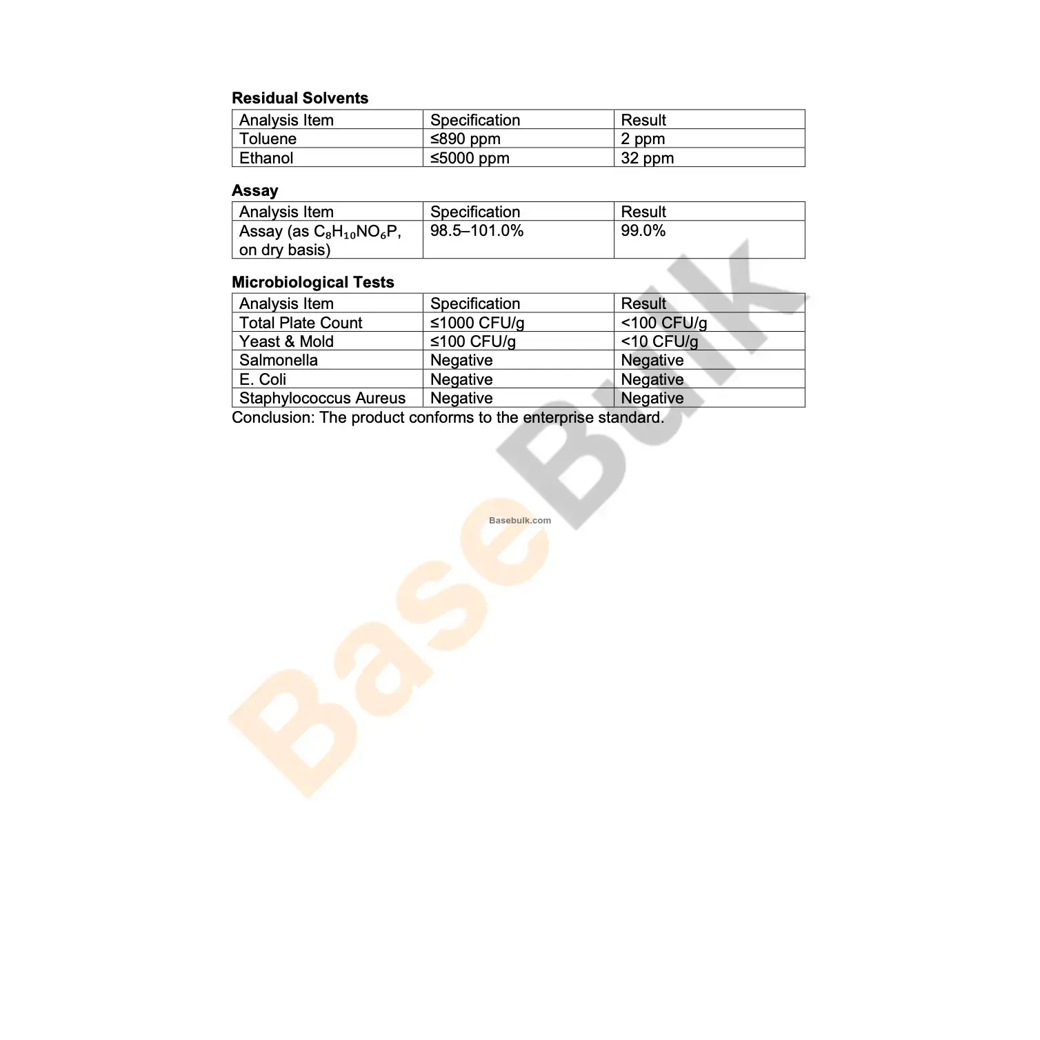 Conclusion: The product conforms to the enterprise standard.