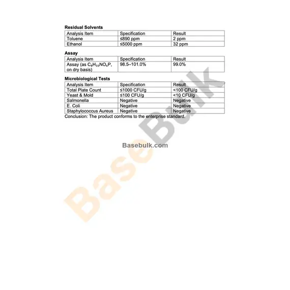 Assay (as C₈H₁₀NO₆P, on dry basis) | 98.5–101.0% | 99.0% |