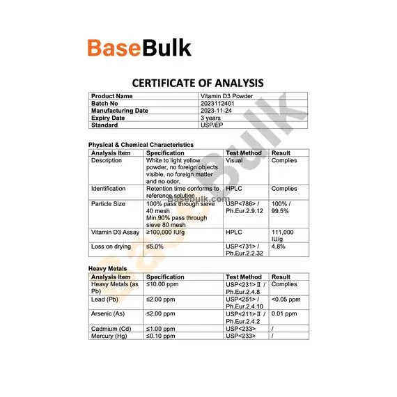 Vitamin D3 Assay | ≥100,000 IU/g | HPLC | 111,000 IU/g |