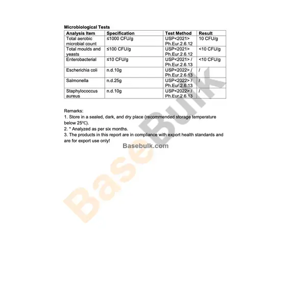 Total aerobic microbial count | ≤1000 CFU/g | USP<2021> Ph.Eur.2.6.12 | 10 CFU/g |