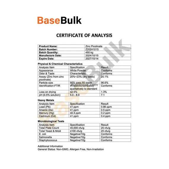 Assay (Zinc from zinc picolinate) | 20%~23% (dry basis) | 20.1% |